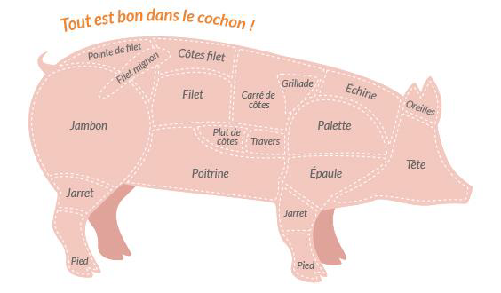 à titre d’exemple : côtes, poitrine, palette, rouelle, saucisses, jarret